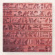 Ein Untersetzer aus rotem Glas mit antiken Hieroglyphen, die auf Stein graviert sind.