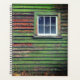 Dieser Planer hat ein Bild eines Fensters und eines Hauses mit alter grüner Farbe darauf.