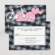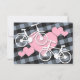 Custom Wedding UAWG Antwortkarten mit einem alternativen Design mit 2 weißen seiner & ihrer Fahrräder über rosa Herzen, und auf einem gekachelten schwarz-blau-grauen Gingham-Muster platziert.