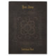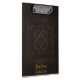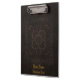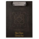 Ein Klemmbrett druckte mit dem Bild eines alten Bucheinbandes, der von Braun bearbeitetem Leder mit dekorativen Mustern gemacht wurde, und optionalem goldenem Text.