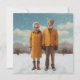 Ernsthaftes Retro-Paar in warmen gelben Kleidern im Winterschnee