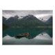 Foto-Druck einer Landschaft mit einem alten Ruderboot in einem See mit dem Spiegelbild der Berge im stillen Wasser, Hjelle, Norwegen.