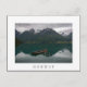 Postkarte einer Landschaft mit einem alten Ruderboot in einem See mit dem Spiegelbild der Berge im stillen Wasser, Hjelle, Norwegen mit weißer Grenze und dem Text: "Norwegen".