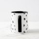 Ein wunderschöner Schwarz-Tan-Hund sitzt auf beiden Seiten dieser Tasse. Der Text zwischen den beiden Bildern sagt: "Am 8. Tag erschuf Gott den COONHOUND und nannte ihn SEHR GUT". Die Hundebilder und das weiße ovale Banner mit den Textfeldern werden auf einem weißen Hintergrund mit schwarzen Pfoten platziert.