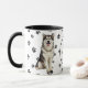 Ein wunderschöner Alaskan Malamute Hund schaut euch von zwei Seiten dieser Tasse aus an. Der Text zwischen den beiden Bildern sagt: "Am 8. Tag erschuf Gott die MALAMUTE und nannte sie SEHR GUT". Die Hundebilder und das weiße ovale Banner mit den Textfeldern werden auf einem weißen Hintergrund mit schwarzen Pfoten platziert.