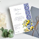 Amalfi Positano Vietri blau Majolica Fliesen Zitronen Hochzeit bearbeitbare Vorlage Einladung sofortige digitale Download, mediterrane Themen blau und gelb Kacheln mit einem Haufen Zitrusfrüchte und Blüten in blauen Keramiken Vase Hochzeitskarten