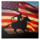 Eine schöne und farbenfrohe Art, Ihre amerikanischen Farben zu zeigen! Diese Kunstfliese zeigt einen Cowboy, der auf seinem Pferd mit einer amerikanischen Flagge im Hintergrund reitet.