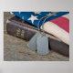 Militärische Hundemarken auf der Heiligen Bibel und der amerikanischen Flagge.