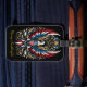 Eine digitale Abbildung eines amerikanischen Glatzenadlers mit einem Schild mit amerikanischer Flagge, umgeben von goldenen Dekorelementen.
