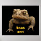 Ein grauenvoll aussehender Amerikanischer Toad (Bufo americanus) schaut aus diesem Poster auf dich. Dieser kleine Amphibien ist braun mit schwarzem, goldfarbenem Olivgrün und orangefarbener Farbe. Seine Warzen unterscheiden ihn von seinen Froschnachbarn. Obwohl sie im Wasser von Teichen, Flüssen, Seen oder Bächen schlüpfen, ziehen die Kaulquappen bald zu Land, wo die Kröten leben ihr Erwachsenenleben. Sein erschreckender Ruf ist ein langer Schrei. Er sieht ziemlich heftig aus, ist aber eigentlich ein sanfter kleiner Typ, der viele Gartenschädlinge, darunter Insekten und Schlämme, isst. Der Text lautet: Back off ! Es kann individuell angepasst oder entfernt werden.