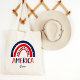 Diese niedliche, moderne Totentasche ist mit einem farbenfrohen, rot-weiß-blauen Regenbogen mit Herz ausgestattet und sagt in trendigem handgeschriebenem Text "America". Dieses coole Urlaubsprojekt eignet sich perfekt für den Unabhängigkeitstag am 4. Juli.