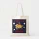 Grundlegende Tasche mit einem lächelnden Apfelkuchen und Sternen. Die Wörter "so amerikanisch wie… Apfelkuchen" schließen den Entwurf ab.