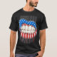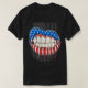 Amerikanische Flagge auf Lippen gemalt, die in einer Schnecke sind. Graue Flagge im Hintergrund.