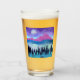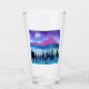 Eine abstrakte Landschaft mit einzigartigen Farben und Texturen, die eine Bergszene mit Bäumen und unangenehmen Nebel in lila, blauen, aquamarinen und zyanfarbenen Tönen zeigt.