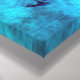 Eine abstrakte Landschaft mit einzigartigen Farben und Texturen, die eine Bergszene mit Bäumen und unangenehmen Nebel in lila, blauen, aquamarinen und zyanfarbenen Tönen zeigt.