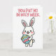 Cette carte montre une simple illustration numérique d'un personnage ressemblant à un lapin blanc aux longues oreilles 🐰 debout sur un fond blanc uni. Il a de petits yeux ronds noirs, des joues rondes et roses, et un sourire ouvert avec une petite langue qui dépasse, lui donnant un air doux et amical qui semble destiné à quelqu'un de proche. Le personnage tient un œuf ovale dans un câlin doux, comme s'il câlinait un petit cadeau pour un ami ou quelqu'un qu'il adore. L'œuf est décoré de bandes ondoyantes et fluides de bleu pastel, de rose doux et de jaune ensoleillé, ajoutant une touche printanière 🌷. Près du haut, un court message est écrit au-dessus du personnage dans des lettres arrondies de style bulle, colorées en rose vif. Le texte est centré et espacé de manière à donner l'impression qu'il s'adresse directement au lapin en dessous, ajoutant une chaleur légère et taquine à la scène. Les jou