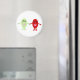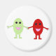 Un aimant avec un dessin animé d'un raisin rouge souriant tenant les mains avec un raisin vert souriant, les deux raisins ont des yeux noirs brillants et des bouches roses.