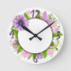 Lavender and pink flowers are featured in zirlar pattern around the perimeter of this clock. The charm is in the Simple, unkomplicated design. Easy to read numbers. This clock may be personalized with a name in the center at no additional charge.