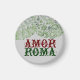 hübsches Detail der Vintagen royalen Spitze mit den Worten "amor roma", zwei sich spiegelnde Wörter, "amor" und "roma" amor ist in dunkelrot, und der Raum ist in dunkelgrünen Farben, in einem verzierten und dekorativen Text oder Schriftart-Stil, und darüber ist ein Teil der dekorativen, blumengrünen Spitze mit Blume und Blätter, ein antikes Stoff