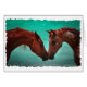 Têtes de deux chevaux Arabes de race d'oseille touchant des nez sur la plage, mer à l'arrière-plan. Moment intime des chevaux dans l'amour : -)