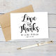 Les cartes de remerciement "Love and Thanks" du mariage moderne offrent un jeu de couleurs noir et blanc moderne avec typographie de script calligraphie manuscrite audacieuse et ludique avec des détails de défilement élégants. Personnalisez le texte personnalisé décontracté mais élégant pour votre jour de mariage. Le libellé personnalisé à l'intérieur peut être supprimé si vous préférez une note manuscrite.