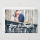 CARTE DE REMERCIEMENTS DE PHOTO DE MARIAGE EN TYPOGRAPHIE LOVE AND THANKS. Conception d'Elke Clarke© pour MonogramGallery imprimée par Zazzle. Envoyez votre message de remerciement de mariage en tant que jeunes mariés à vos amis et à votre famille en utilisant cette carte de photo de mariage rétro avec les mots "Love & Thanks" écrits en superposition de texte de script de typographie manuscrite blanche en gras. Remplacez la photo d'exemple par la vôtre. Ajoutez votre message de remerciement personnel au verso ou laissez-le vide et écrivez votre message en personne. D'autres couleurs sont disponibles. Le fond en toile de lin est un effet de photo imprimée.