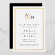 Einfach und elegant speichern Sie die Dattelkarten benachrichtigen Sie Ihre Gäste über Ihre bevorstehende Hochzeit im zeitlosen Stil. Knackige Schwarz-Weiß-Karten mit goldenen Folienakzenten ermöglichen die Bearbeitung Ihrer Initialen in einem Monogramm-Design, verbunden mit einem Kalligraphieskriptampersand. Unter "Save the Date" erscheint unter der Überschrift Ihr Name, Ihr Hochzeitsdatum und Ihr Standort darunter.