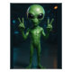 Alienígena verde em estilo 3D futurista, com grandes olhos pretos brilhantes e pele detalhada, fazendo o gesto de paz com as duas mãos. Uma presença carismática e enigmática em um cenário de luzes neon espaciais.