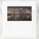 Rechteckiger Aufkleber aus Foto mit traditionell anmutenden Kanalhäusern mit bunten Lichtern und Reflexion im Wasser in der Nacht im Rotlichtviertel im Stadtzentrum von Amsterdam, Niederlande.