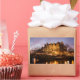 Rechteckiger Aufkleber mit Amsterdamer Kanalhäusern in traditionellem Stil neben einer Brücke über die Prinsengracht und die Brouwersgracht, die während der Blauen Stunde in den Niederlanden bei Dämmerung beleuchtet wird.