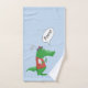 Serviette à sueur de Golfer faite en bleu clair avec des dessins animés d'un golfeur en alligator habillé. Le texte en noir dans la bulle de discours lit Fore! et peut être personnalisé pour lire ce que vous voulez.