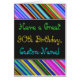 Cette carte de voeux amusante, colorée et fantaisiste à thème d'anniversaire présente un voeu d'anniversaire chaleureux comme "Ayez un grand 90e anniversaire, Custom-Name!" sur le devant. Le nom sur le devant peut être customisé. Il y a aussi des bandes multicolores en haut et en bas de l'avant. L'intérieur comporte un message d'anniversaire qui peut être personnalisé. Une carte de voeux comme celle-ci pourrait être une façon amusante d'offrir des voeux d'anniversaire à quelqu'un qui célèbre son quatre-vingt-dixième anniversaire. [~Z0000269]