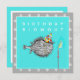 Invitations créatifs de fête d'anniversaire, avec un poisson de dessin animé soufflant une bougie d'anniversaire.