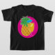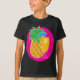 Eine Ananas mit einer grünen Spitze, ist auf einem cyan-blauen Hintergrund. Im Vordergrund gibt es ein Ananascocktail in einem hohen aufgehaltenen Glas, mit einem Zitronenkeil und einem kleinen blauen Regenschirm.