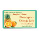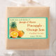 Trio Orangen, eine mit einem Ananas aufgeschnitten, werden in die verlassen untere Ecke dieses Etiketts mit einem hellgelben Hintergrund eingebettet, umgeben von einem Rand und einem Hintergrund von mäßig türkisfarbenem Grün, was dieses Etikett zu einem perfekten Etikett für die Gläser hausgemachten Ananas-Orangenmarmelade oder Konfitüren macht. Der Text befindet sich im Vorlagenformular, sodass Sie ihn auf das ändern können, was Sie möchten.
