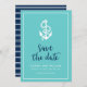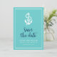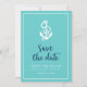 Stilvolle Nautic Save the Date mit einem Anker und den Worten "Save the Date" in einem stylish blauen Skript vor einem türkisfarbenen Hintergrund mit weißem Rand. Die Karte weist ein weißes Streifen-Muster auf einer blauen Rückseite auf. Karo andere Hochzeitsartikel hier https://www.zazzle.com/rosewoodandcitrus/gifts?cg=196540141241316965&rf=238364477188679314 Personalisieren Sie sie durch Ersetzen des Platzhaltertextes. Für weitere Optionen, wie zum Beispiel den Schriftart zu ändern und ihn zu vergrößern oder zu verändern, klicken Sie auf den Button "Anpassen". *Bitte beachten Sie, dass das Zazzle-Wasserzeichen in der Zoomvorschau NICHT auf dem gedruckten Endprodukt © Rosewood and Citrus erscheint