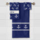 Ajoutez une touche personnalisée à votre salle de bain de style nautique avec ces draps de bain imprimés avec un motif d'ancre à baldaquin bleu marine. La serviette à main peut être personnalisée avec votre propre texte. Choisissez le jeu ou les éléments individuels dans le menu déroulant. Voir le tapis de bain ou d'autres éléments de coordination dans cette collection de design à Camp_and_Cottage sur Zazzle.