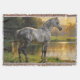 Andalusian Stallion by the Lake showcases a regal silver-gray horse standing at the water’s edge during a golden, late-day glow. The soft light reflects across the lake and highlights the stallion’s strong frame and graceful posture. The surrounding landscape—lush grass, calm water, and warm sunset tones—adds a peaceful, classical feel to the artwork. It’s a serene moment that captures both strength and quiet beauty.