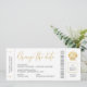 Chic Gold Muschel auf einem minimalen und modernen Boarding Pass Flugzeug Ticket "ändern Sie das Datum" Strand Ziel Ankündigung für eine Hochzeit, die verschoben oder umgestellt wurde. Alle Formulierungen im unteren Teil des Tickets sind editierbar, sodass Sie kreativ und Anzug Ihre Hochzeitsstätte oder verschiedene Sprachen perfekt. Der Stil wurde entworfen, um einen formelleren Hochzeitslook am Strand zu ergänzen und gleichzeitig Spaß zu haben mit einem Strandlook und dem Thema Reisen.