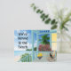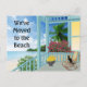 Änderung der Wasserfarbe der Postkarte. "Wir sind zum Strand gezogen. Haus am Strand mit Blume, Stuhl und Katze.
