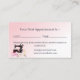 Eine stilvolle Bridal Kleidung Änderungen Terminkarte mit einer Schneiderpuppe und Nähmaschine geschmückt, mit rosa Saitenleuchten alle auf einem blassrosa Farbverlauf Hintergrund mit Platz zum Schreiben in den nächsten Termin und Zeit Ihres Kunden. Ideal für kleine Unternehmen wie z.B. Schneider, Seemannsfirma, Umbauservice und vieles mehr. Der gesamte Text kann auf Ihre geschäftlichen Bedürfnisse zugeschnitten und personalisiert werden. Die Vorlage für die Erinnerung befindet sich auf der Kartenrückseite, zusammen mit den Angaben zum Unternehmen und den Kontaktinformationen.