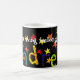 Eine klassische weiße Tasse für jemand rief Andrew mit einer handgemalten Papiercollage des Namens, Andrew an, besprüht mit den roten und gelben Sternen, auf einem schwarzen Hintergrund.