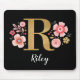 Ein wunderschönes, mit Monogramm, rosafarbenes, blumenfarbenes Mauspad mit rosa Blume und einem Imitat mit goldfarbenem Monogramm R auf schwarzem Hintergrund. Personalisieren Sie das Mauspad, indem Sie unter dem Monogramm Ihren Namen hinzufügen. Macht ein lustiges Geschenk für einen Freund oder für eine Brautjungfrau. Entworfen für Sie von BlackBerry Boulevard.