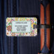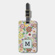 Personalisierte Gepäckanhänger mit 70er-Retro-Blumenmuster, die gelb rosa und lila funky Blume auf hellblauem Hintergrund. Personalisieren Sie die Vorderseite mit Ihrem benutzerdefinierten Monogramm Initial. Fügen Sie Ihre Kontaktinformationen und Ihre Adresse auf der Rückseite ein. Ändern von Schriftart und Farben mithilfe des Designtools