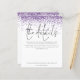 Hochzeitsdetails Lila Glitzer Confetti-Abschluss. Eine preisgünstige Alternative 4.5" x 5.6", um Ihren Gästen alle Details lassen. Erhältlich in einem SEMI GLOSS 110lb CARD STOCK, welches die Standardoption ist (empfohlen für Einladungen), ODER einem SATIN FINISH 80lb THINNER PAPER STOCK (ideal für Gehäuse). Umschläge sind optional und etwas größer als die Kartengröße. Lass deinen Gästen Informationen wie Anfahrtsbeschreibung und Unterkunftsinformationen für deine Hochzeit, wenn du ihre Einladungen versenden kannst. Dieses elegante Design hat Set stilvolle große Typografie für den Titel The Details und die Erholung des Textes kann leicht personalisiert werden, um Ihre Worte. Eine lila Imitat Glitzer-Grenze ist oben auf beiden Seiten. Sie können jede beliebige Farbe für Text- und Hintergrundfarben auf beiden Seiten über die weitere Option anpassen.