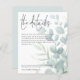 Hochzeitdetails Eukalyptus-Script-Abschluss. Eine preisgünstige Alternative, bequem für Gehege. Lass deinen Gästen Informationen wie Anfahrtsbeschreibung und Unterkunftsinformationen für deine Hochzeit, wenn du ihre Einladungen versenden kannst. Dieses elegante Design hat Set stilvolle große Typografie für den Titel The Details und die Erholung des Textes kann leicht personalisiert werden, um Ihre Worte. Schöne Eukalyptus-Blätter in sanft aquamarinem Blau schmücken die rechte Seite und werden allmählich in den Hintergrund getönt und einige Texte überlagert. Auf der Rückseite befindet sich ein Pulverblau, der auf Wunsch über die Option Weitere anpassen in eine andere Farbe geändert werden kann.