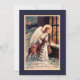 Cette invitation vintage de Noël montre un ange du ciel avec un petit cerf portant des cadeaux de Noël en regardant dans la fenêtre le soir de Noël pour apporter la paix et la bonne volonté.