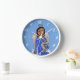 Diese Wanduhr aus Holz hat weiße Hände und Zahlen mit einem Engel in einem blauen Kleid, mit Sternen, die auf einer Wolke sitzen und eine Katze mit einem weißen Engel halten, beide haben silberne Halos auf einem himmelblauen Hintergrund.