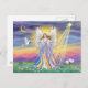 Ein schöner Engel mit einem Kleid aus pastellfarbenen Bändern segnet die Nacht als eine Taube in der Nähe und die Sonnenstrahlen füllen den Himmel.