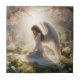 Dieses Keramik Fliesen Kunstwerk präsentiert eine ruhige und angelsächsische Szene. In der Mitte befindet sich eine kniende Figur mit großen, weißen Flügeln, die in einem von der Schulter getragenen, fließenden weißen Ziegenkleid eingezogen sind. Das lange Haar der Figur kaskadiert sanft, was zu ihrer ruhigen und himmlischen Präsenz beiträgt. Der Rahmen ist üppig, gartenähnlich und mit feinen, weißen Blume und üppiger Vegetation gestaltet, was eine ätherische Atmosphäre schafft. Im Hintergrund sind die Grabsteine sorgfältig positioniert, was darauf schließen lässt, dass dieser friedliche Garten Teil eines Friedhofs sein könnte. Weiche Lichtbalken filtern durch die Bäume, wobei ein himmlisches Glühen auf die kniende Figur, die feierliche und dennoch beruhigende Essenz der Szene. Während die Kachel den traditionellen Buntglasstil nachahmt, trägt sie ihren eigenen Charme, mit subtilen Schattierungen und textuellen Elementen, die der Komposition Tiefe verleihen. Dieses Stück vereint Themen der Reflexion, der Erinnerung und der spirituellen Ruhe und macht es zu einem eindrucksvollen Beispiel für künstlerisches Geschichtenerzählen durch Keramik-Handwerk.